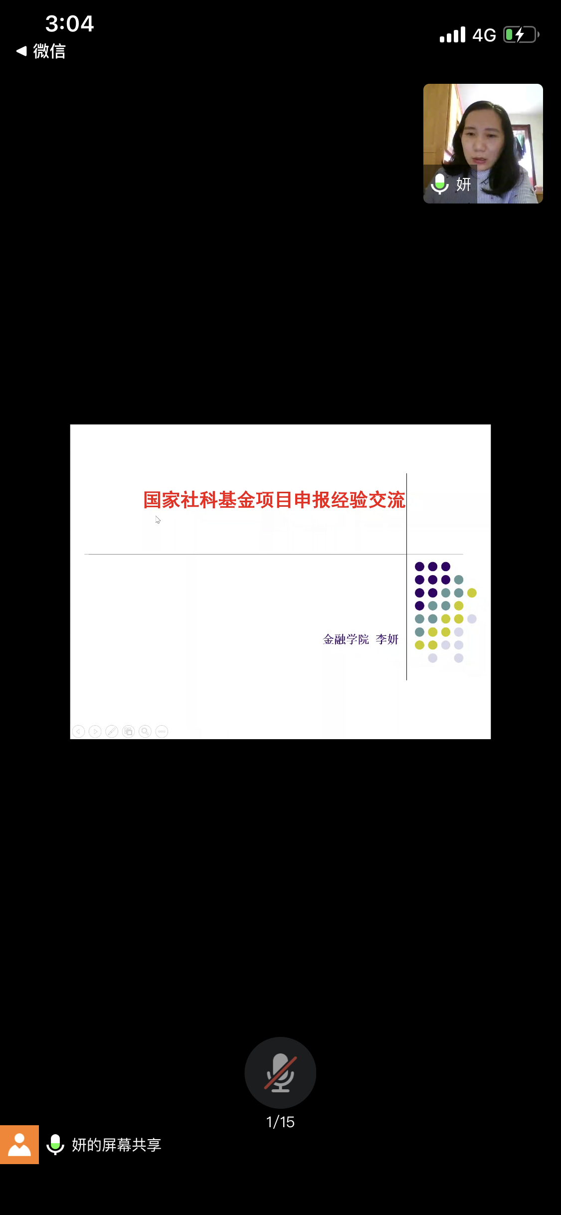 7月2日下午3点,太阳成集团tyc邀请金融系副教授李妍作了题为《国家社科基金项目经验交流》的线上云讲座。讲座由太阳成集团tyc副经理刘颖主持,40余名教师和研究生参加。