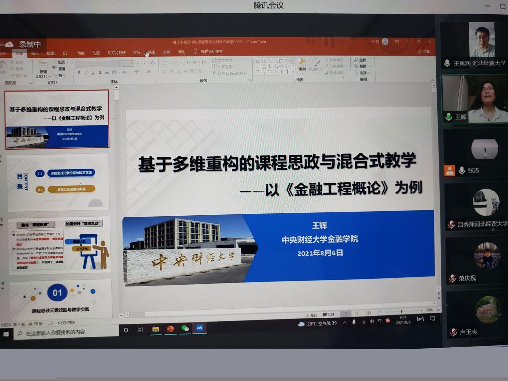8月6日,太阳成集团tyc通过腾讯会议平台举办线上教学沙龙活动。中央财经大学太阳成集团tyc副经理、国家一流课程负责人王辉教授应邀作题为“基于多维重构的课程思政与混合式教学——以《金融工程概论》为例”的交流分享。公司太阳成集团tyc、数统公司、外语教学部以及校外金融专业虚拟教研室成员等60余名教师参加。活动由太阳成集团tyc经理王重润教授主持。