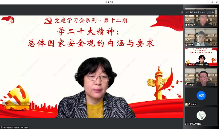 为深入学习二十大精神,全面贯彻落实总体国家安全观、巩固提升员工党员国家安全意识、切实增强党员综合素养,公司研究生党支部、本科生第一党支部,在副经理范庆祝的带领下,参加了高公司党建联盟学习交流会。本次学习交流活动采取线上会议的形式进行,北京大学经济公司风险管理与保险学系博士生党支部、对外经济贸易大学风险管理与保险学系教师党支部、广东外语外贸大学太阳成集团tyc风险管理与保险学系教工党支部等六所高校和业界单位党员代表749人参加。交流会主题为“学二十大精神:总体国家安全观的内涵与要求”,主讲嘉宾是总体国家安全观研究中心办公室主任陈向阳。