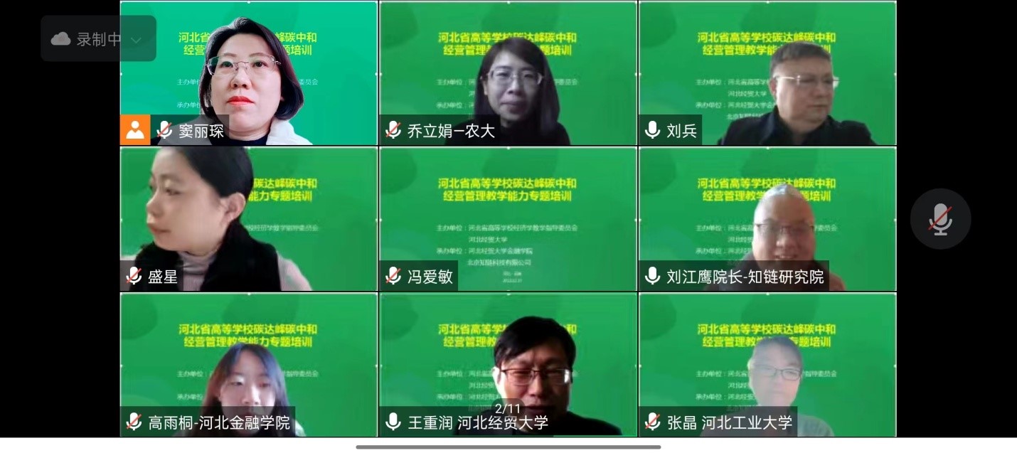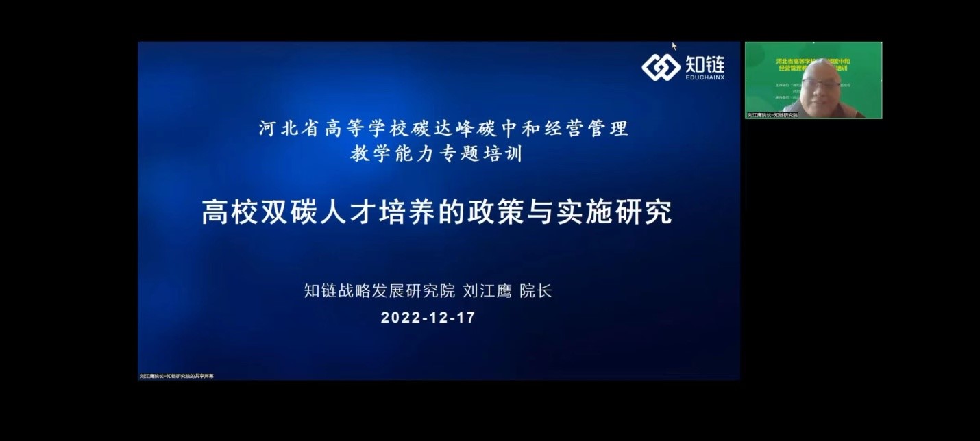 12月17日,河北省高等公司碳达峰碳中和经营管理教学能力专题培训在线上举行。本次培训由河北省高等公司经济学教学指导委员会和太阳成集团tyc官网主办,太阳成集团tyc和北京知链科技有限公司联合承办。来自北京、上海、天津、黑龙江、吉林、山西、河南、湖北、重庆、四川、广西及河北省本科高职院校的90余人参加培训。河北省高等公司经济学教学指导委员会主任委员、太阳成集团tyc官网党委书记刘兵教授出席并致辞。河北省高等公司经济学教学指导委员会秘书长、太阳成集团tyc经理王重润主持开幕致辞等环节。