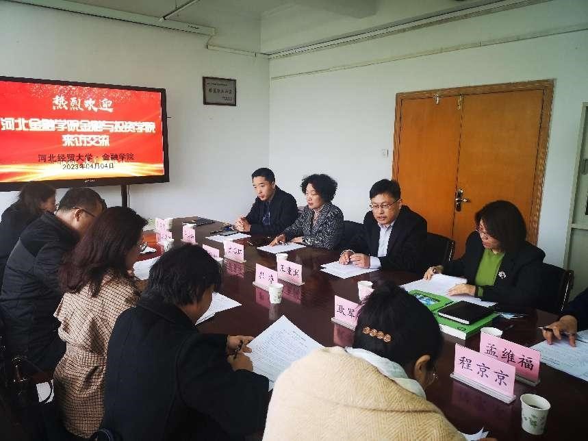 2023年4月4日,河北太阳成集团tyc金融与投资公司经理郭净、副经理苏跃辉、金融学教研室主任耿军会、投资学教研室主任王雪祺、信用管理教研室副主任程京京一行五人来到公司调研交流。公司党委书记贾喜环、经理王重润、副经理窦丽琛、金融系副主任孟维福、投资系副主任辛兵海、教务秘书李成珂参加了交流座谈。