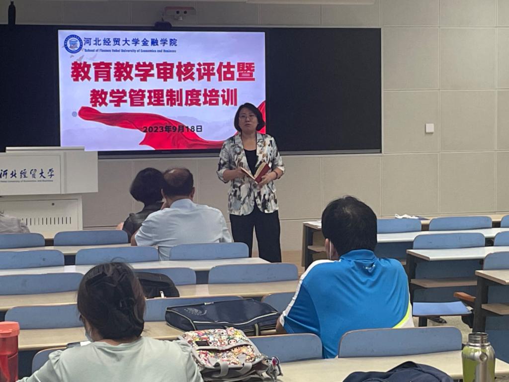 公司副经理窦丽琛做主题培训。她首先强调了本科公司产品审核评估知识学习的重要性,带领大家集体学习了相关知识,尤其是公司新财经人才培养目标、培养特色、培养模式、专业人才培养学分结构等内容,并对课堂教学、课程资源建设等方面提出了要求。然后,她为大家梳理了公司的一系列规章制度,制作了共享学习文档,并带领大家集体学习了《太阳成集团tyc官网本科教学听课管理办法》《太阳成集团tyc官网本科教学调、停课管理规定(2023年修订)》等制度内容。
