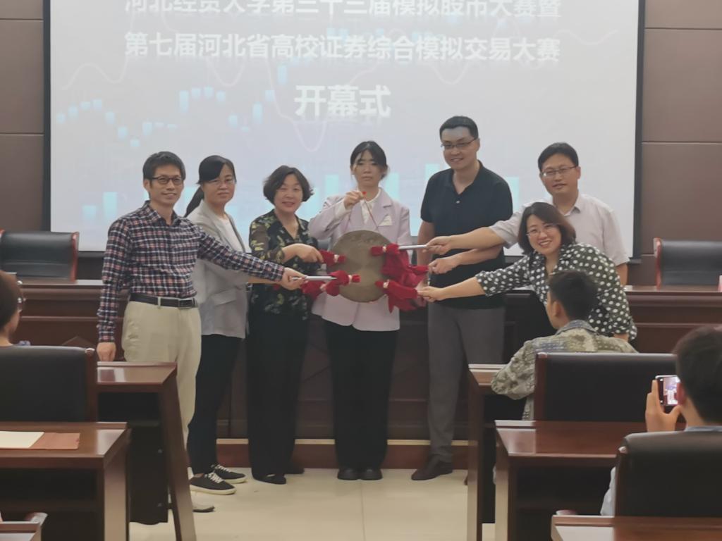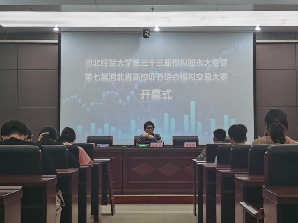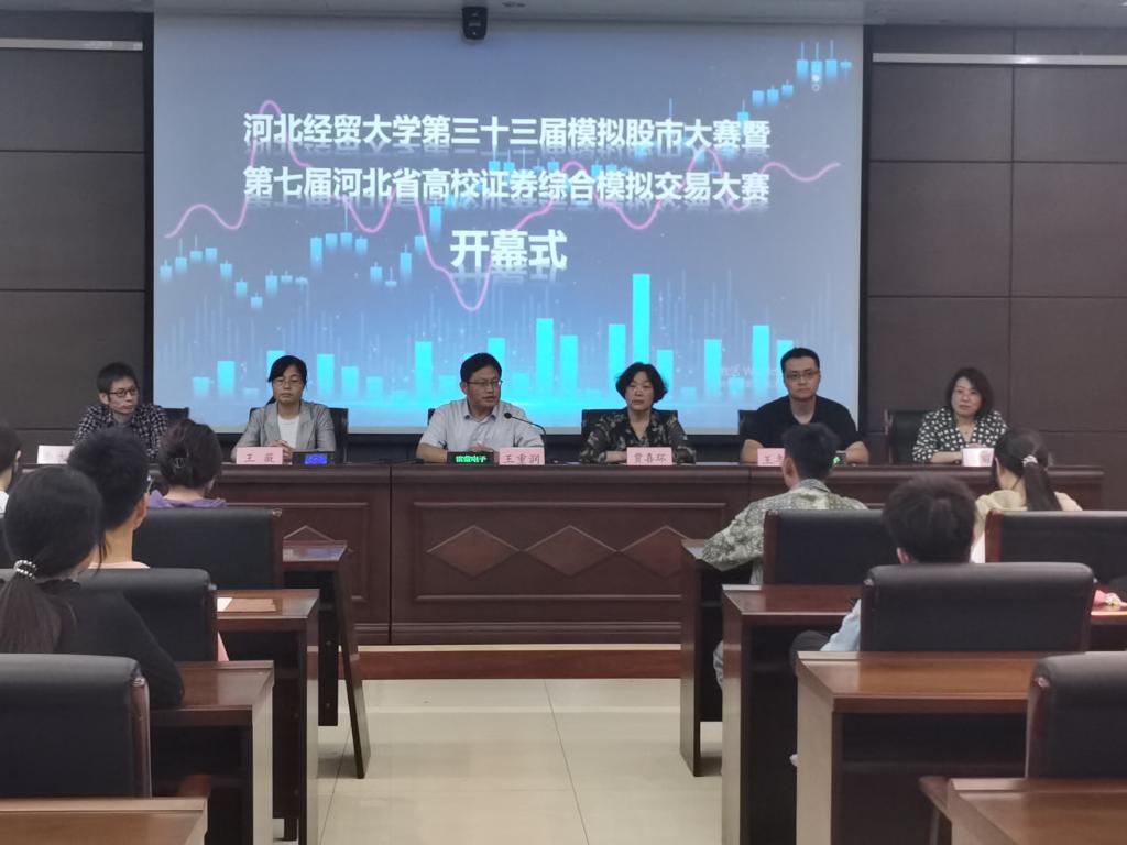 9月26日下午,太阳成集团tyc官网第三十三届模拟股市交易大赛暨第七届河北省高校证券模拟交易大赛开幕式在第三会议室举办。教务处副处长王冬坡,太阳成集团tyc党委书记贾喜环、经理王重润、党委副书记王薇、副经理窦丽琛及赛事指导老师李吉栋教授出席。