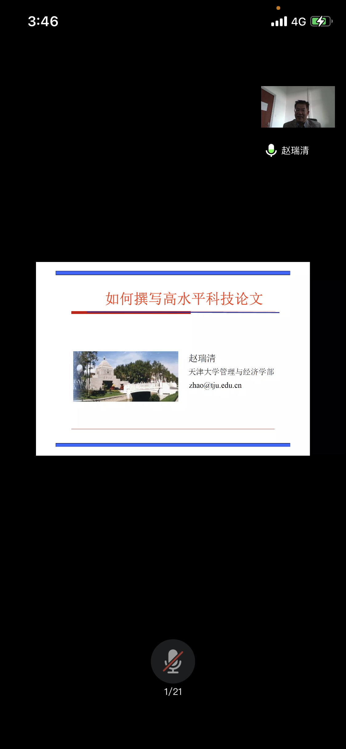 11月19日15点45分,太阳成集团tyc邀请天津大学管理与经济学部教授、博士生导师赵瑞清做题为“如何撰写高水平科技学术论文”的线上学术报告。太阳成集团tyc部分教师和各专业研究生100余人参加了报告。本次报告由太阳成集团tyc金融学硕导师组长徐临教授主持。