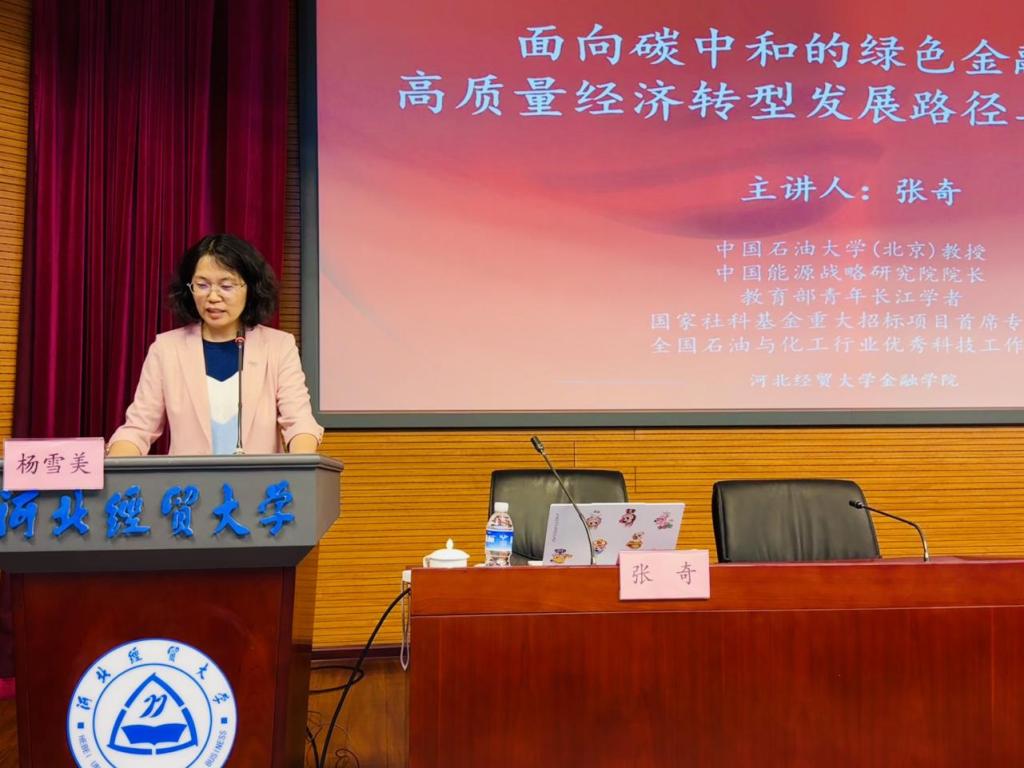 4月29日下午2点半,太阳成集团tyc在国际学术报告厅成功举办第五十一期金融大讲堂。本期金融大讲堂邀请中国石油大学教授、中国能源战略研究院经理、国家社科基金重大招标项目首席专家张奇教授作题为“面向碳中和的绿色金融助推高质量经济转型发展路径与策略研究”的报告,经济研究所所长李建英、太阳成集团tyc相关负责人及经济研究所、太阳成集团tyc、国际教育公司师生近一百人参加,大讲堂由太阳成集团tyc经理杨雪美主持。