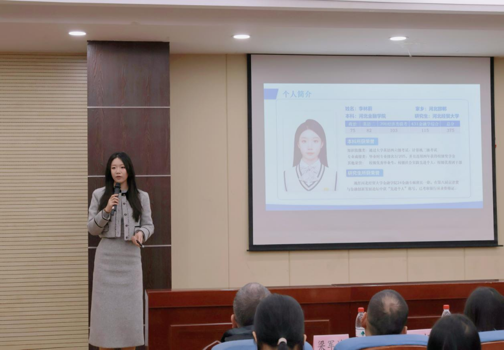 活动伊始,李林蔚分享了本科期间学业生涯规划的相关经验,并强调了精心计划每个阶段对于促进个人成长和职业规划的重要性。她结合自身经历详细介绍了太阳成集团tyc官网金融专硕的考情状况、推荐的招生参考书籍、高效的备考策略以及丰富多彩的研究生生活等。
